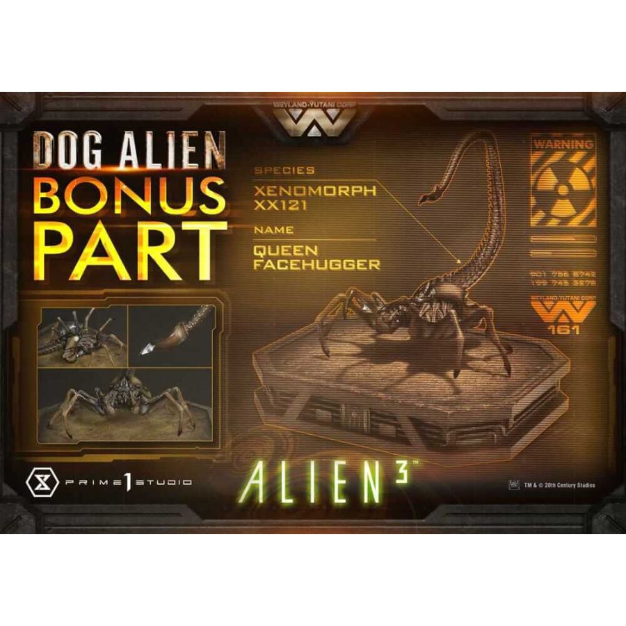 - Base à thème Alien 3 - 2 x têtes interchangeables (bouche ouverte, bouche fermée) - 2 x bouches intérieures interchangeables (étendue, rétractée) - 1 x Support de tête - 2 x Plaques de logo de titre (métal, noir) - 1 x Queen Facehugger [PIÈCE EN PRIME] (en anglais) - Limité à 500 pièces
